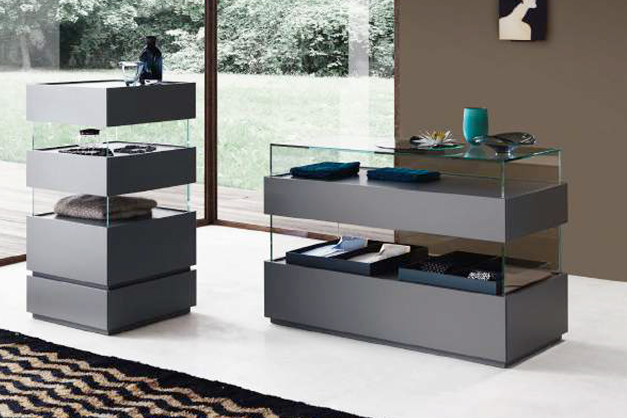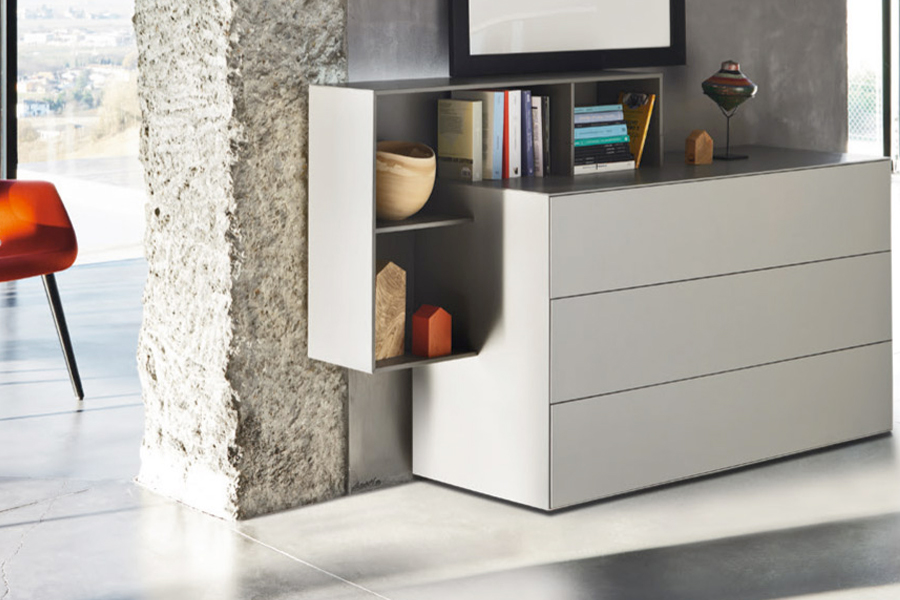 cod. beta beta Il frontale del primo cassetto sporge leggermente dal top diventando presa maniglia. Il design molto geometrico viene smorzato dal colo...